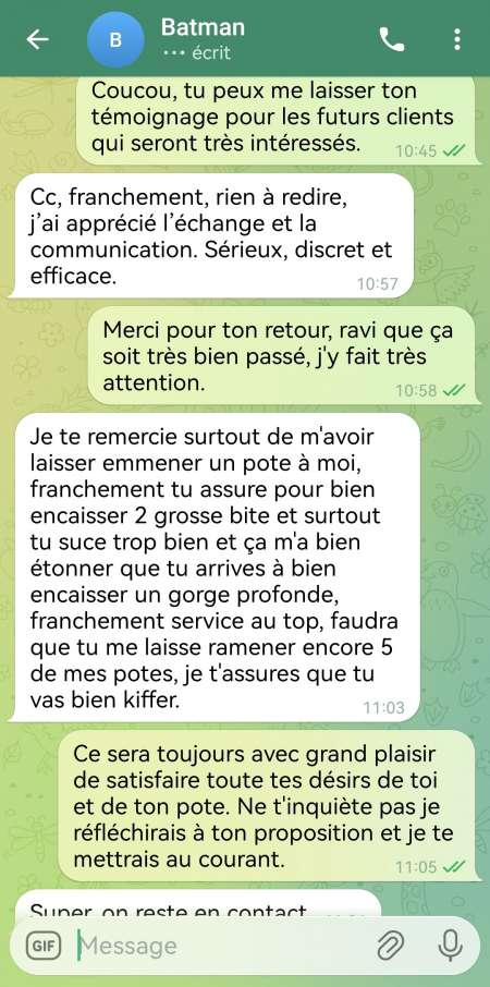 Coucou tout le monde, j'espère que vous allez tous très bien. Je suis créatrice de contenu vidéo et je propose des rdv de plan uniquement aux gens qui achète mon contenue vidéo et il pourra réserver directement son rdv avec moi. Pour plus d'informations et ceux qui sont très intéressés, n'hésitez pas à me contacter uniquement sur Telegram: princesse97 et je vous enverrai une capture de mon compte pour pouvoir voir toute mes photos.