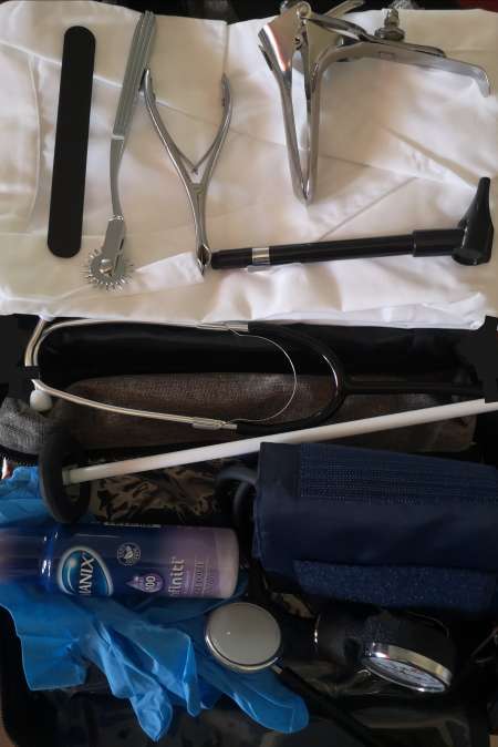 Matériel médical neuf ou à usage unique: otoscope, abaisse-langue, tensiomètre, stéthoscope, thermomètre “à l’ancienne”, spéculums vaginal et anal, gants, tenue médicale, etc.